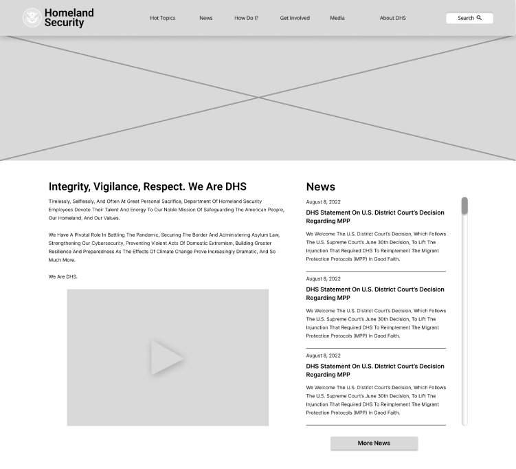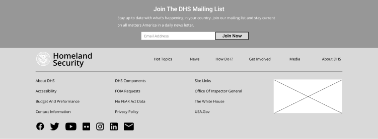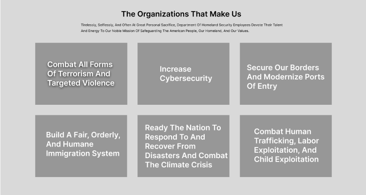 The Department of Homeland Security (DHS) website lacks organization, consistency and an order of importance. The current site does not have a reliable information architecture, and the design is cluttered and overwhelming. Thus, causing the user to gain little to no knowledge when using the site.